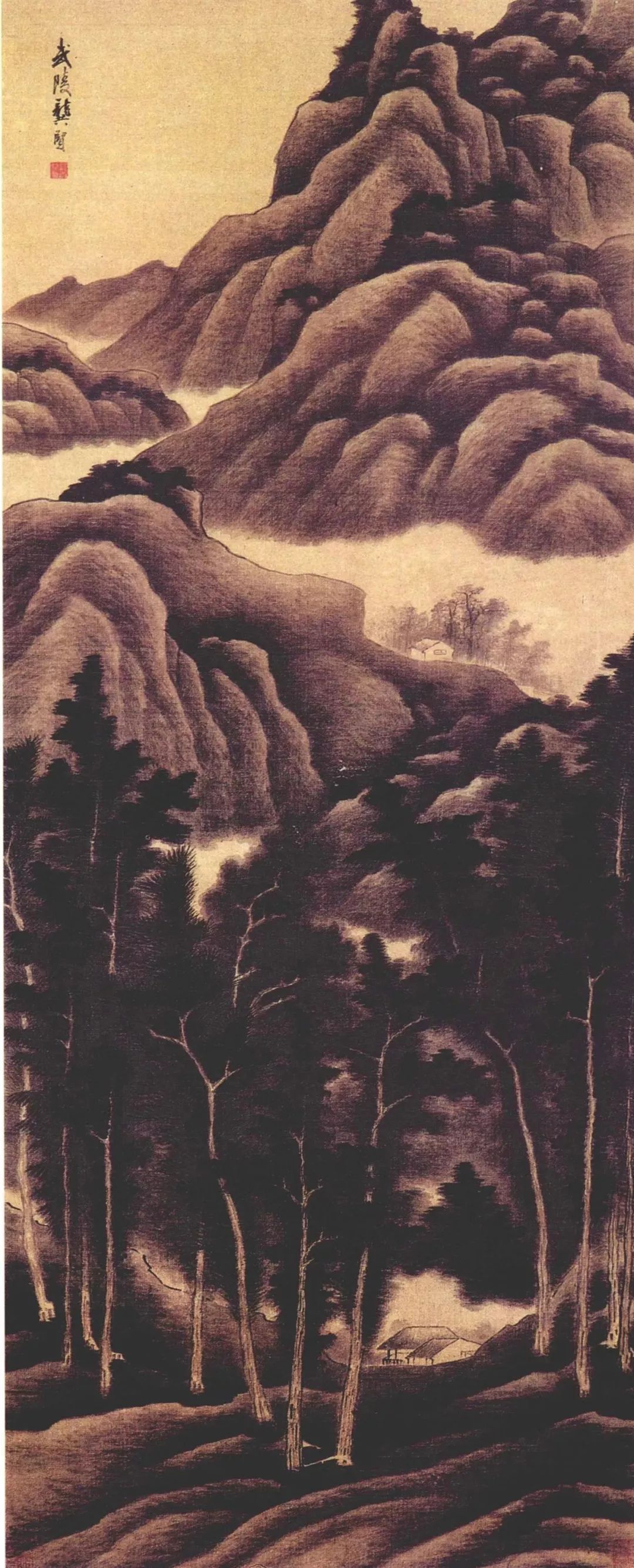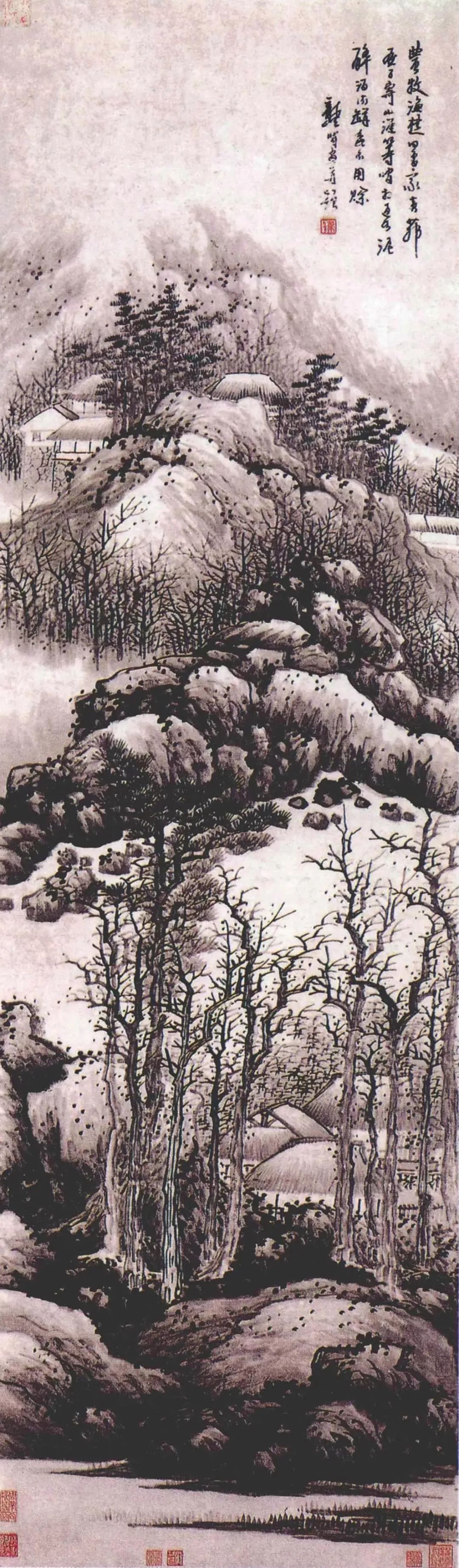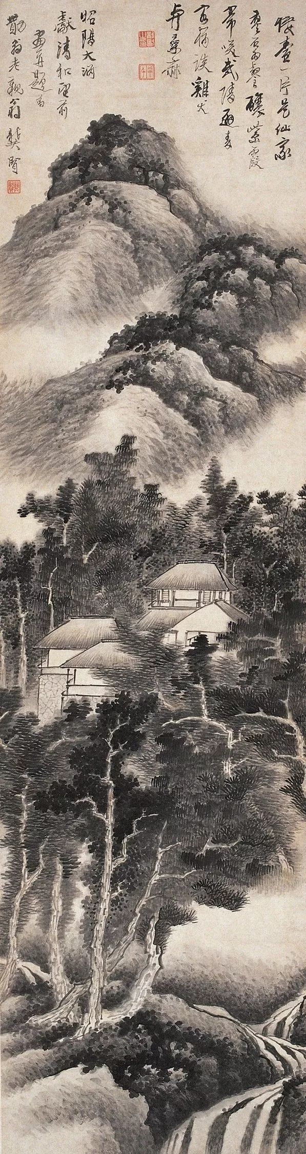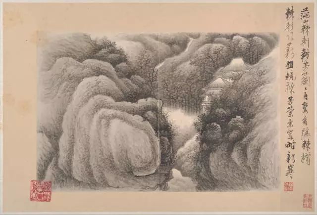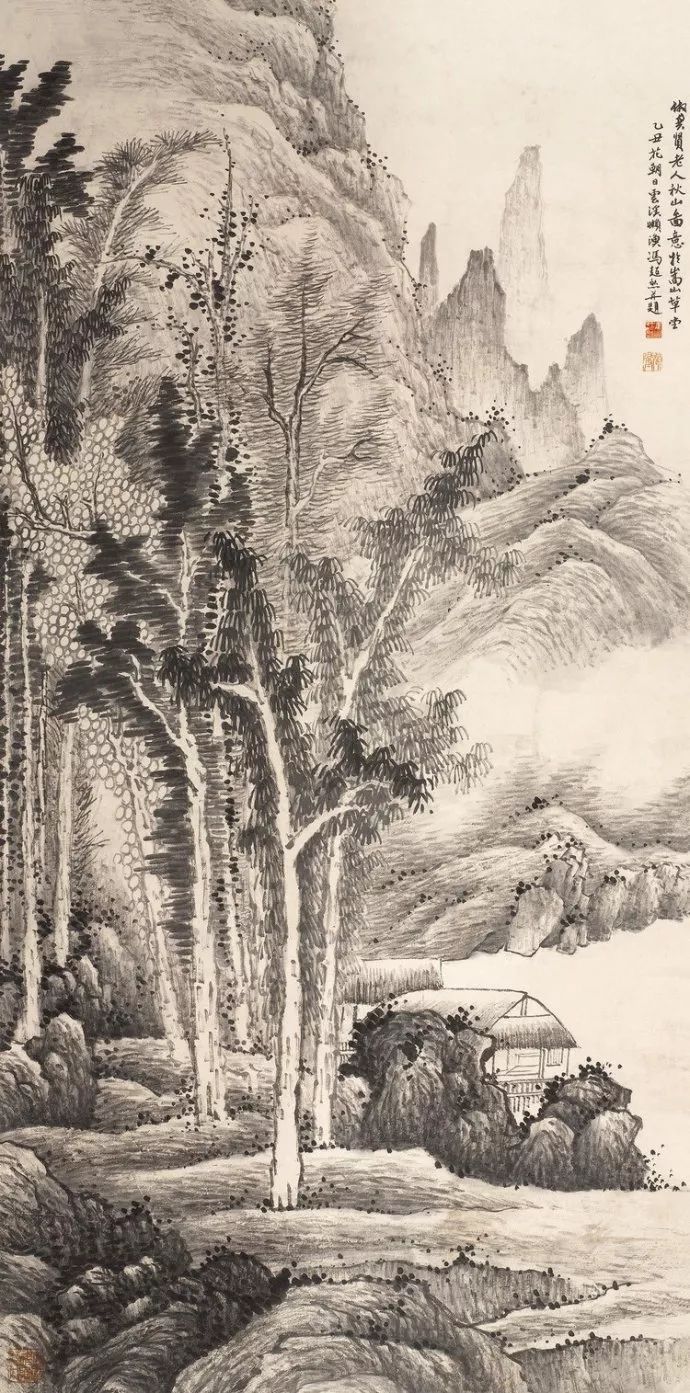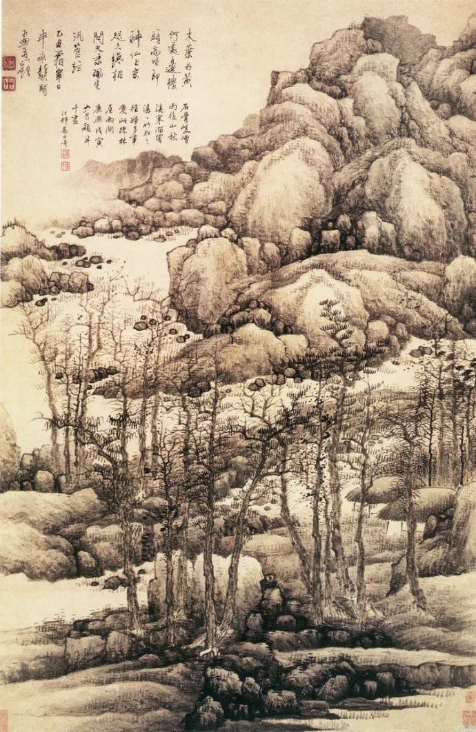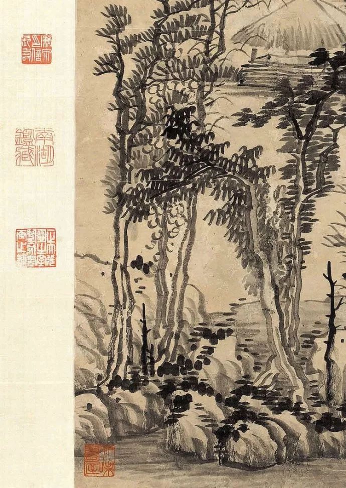 龚贤善用积墨法,笔墨苍黑深沉,层次丰富。他善于用积墨法表现山石的结构和树木的枝干,使画面呈现出一种苍润而厚重的美感。