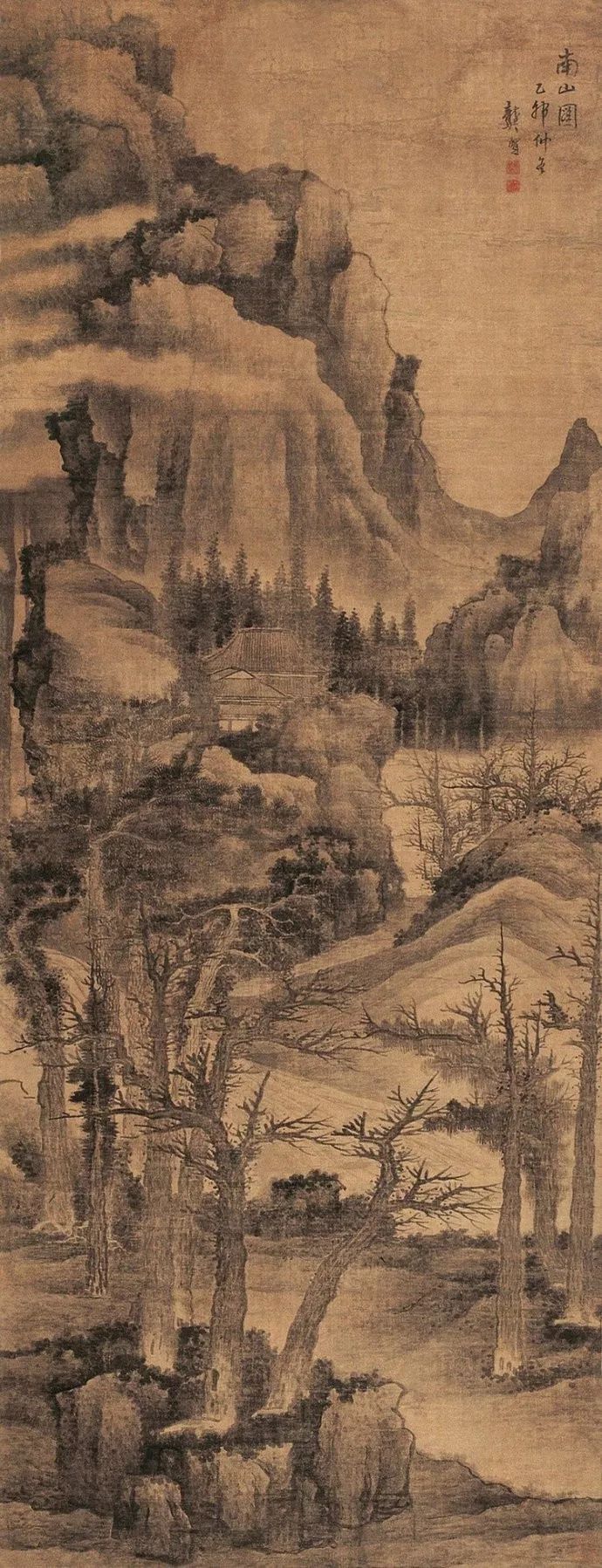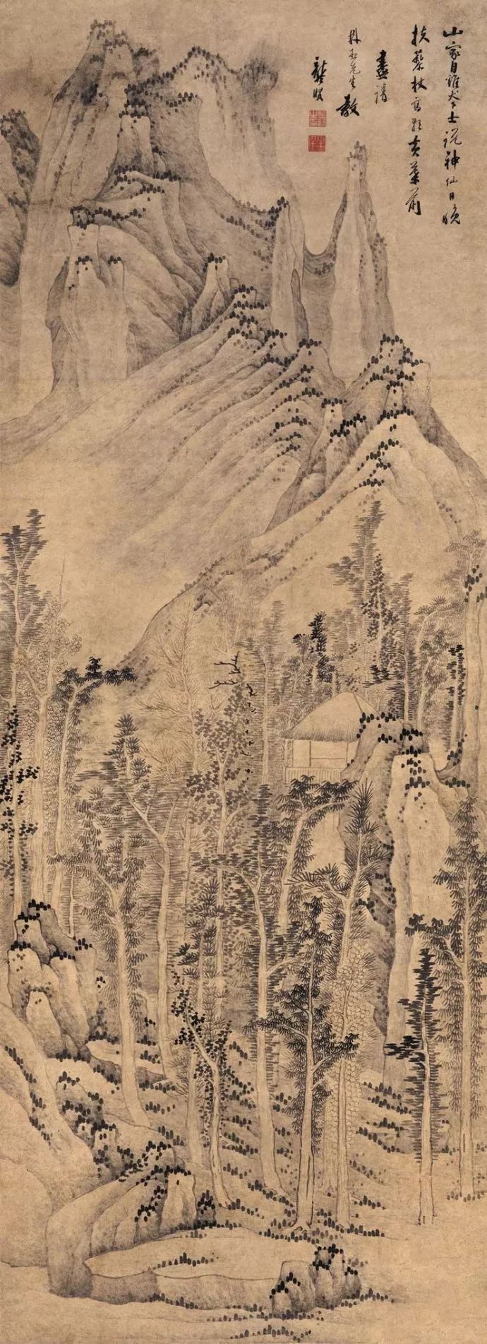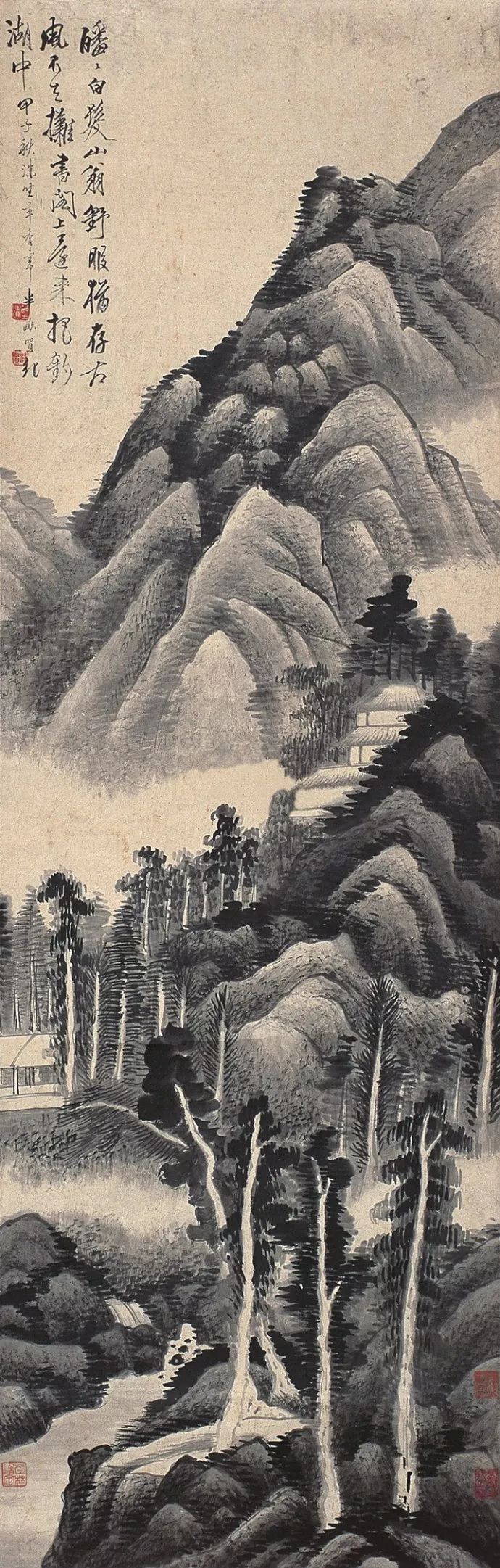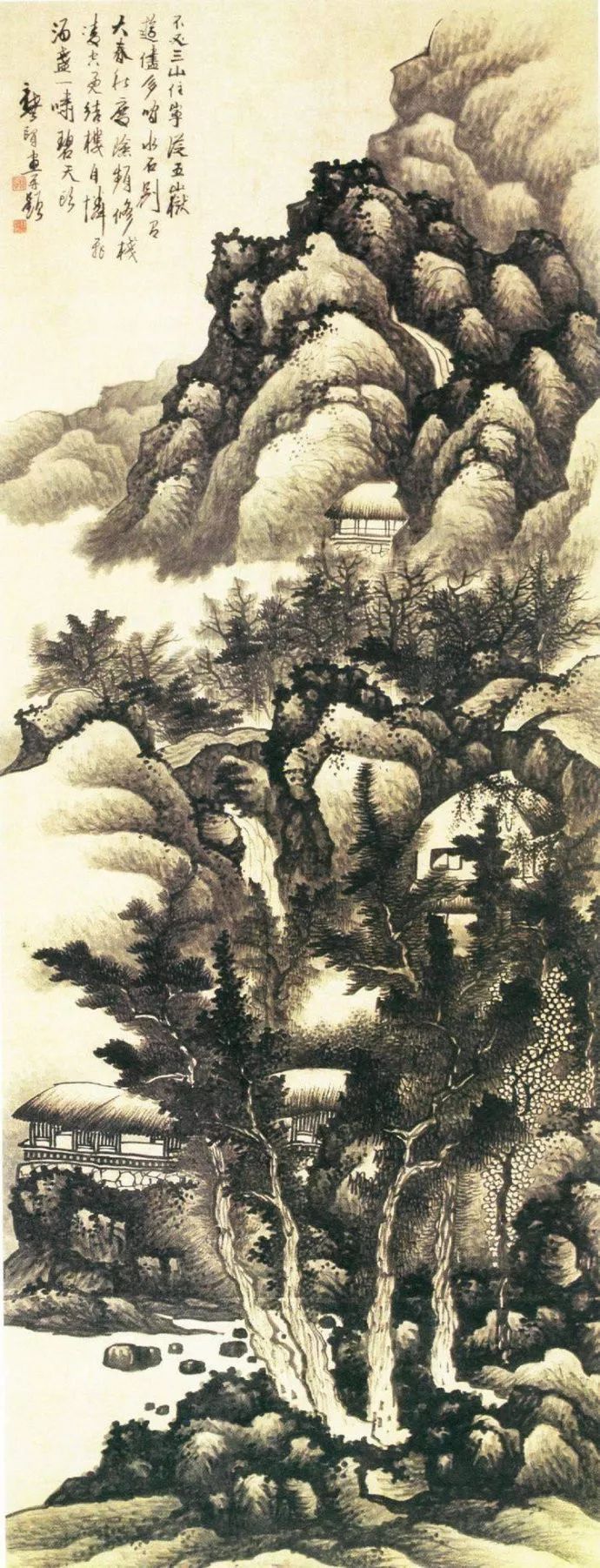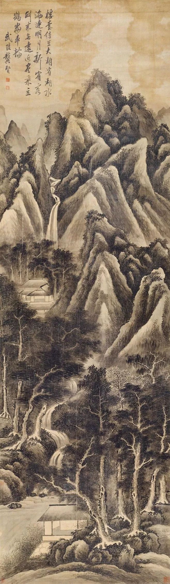 龚贤善用积墨法,笔墨苍黑深沉,层次丰富。他善于用积墨法表现山石的结构和树木的枝干,使画面呈现出一种苍润而厚重的美感。
