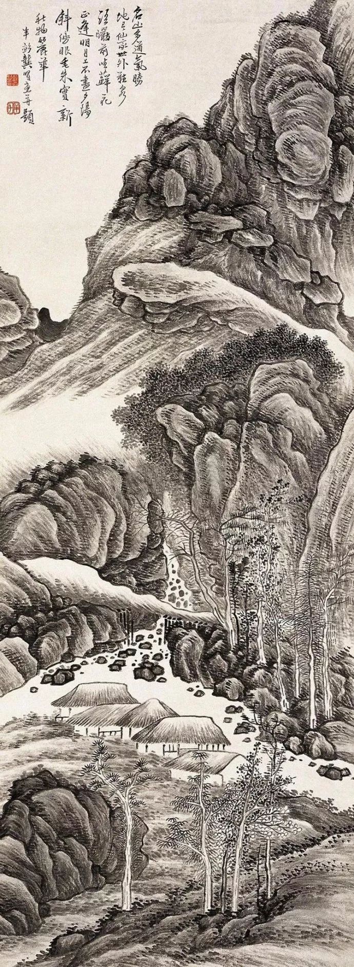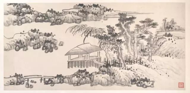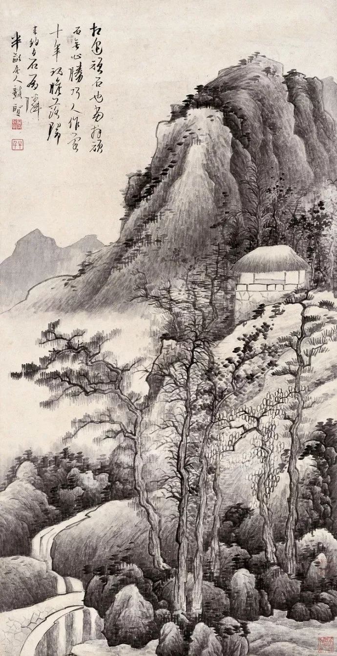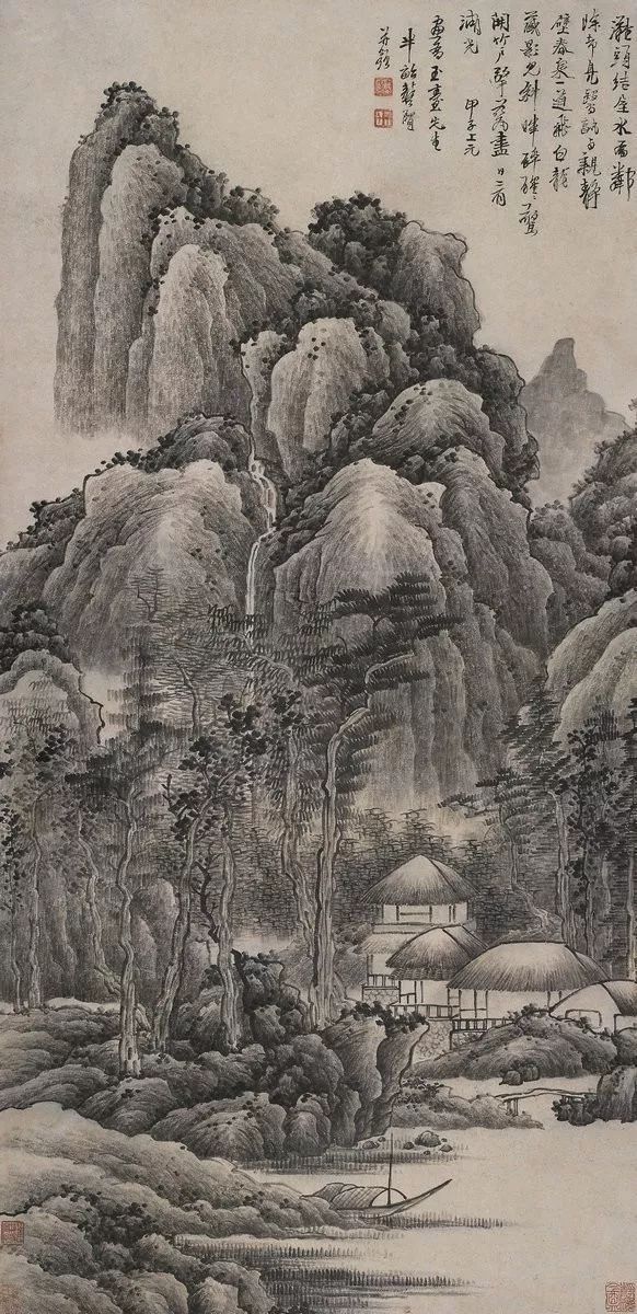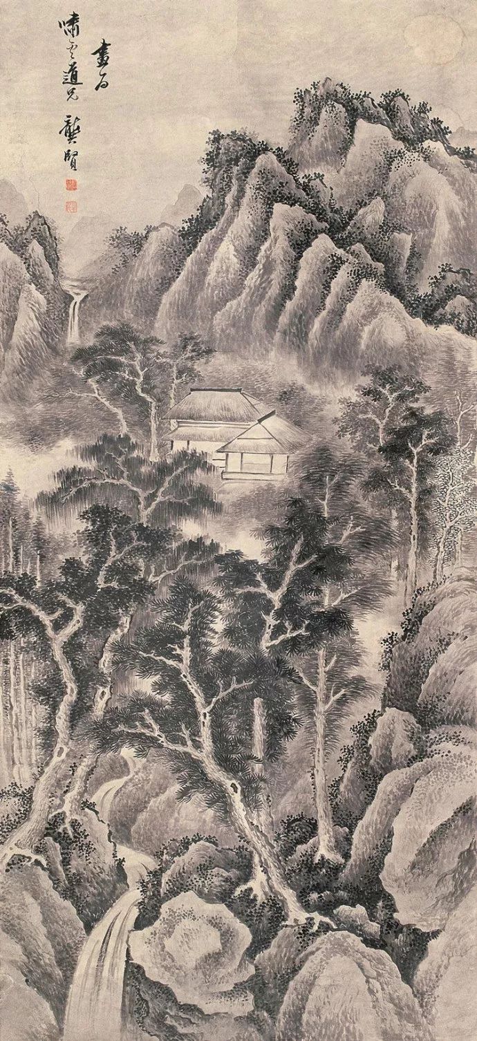 龚贤的山水画构图巧妙,善于利用黑白对比和虚实关系来营造空间感和节奏感。他的画面往往既有繁复的积染和刻画,又有简洁明快的留白,使得整个画面既丰富又透气。
