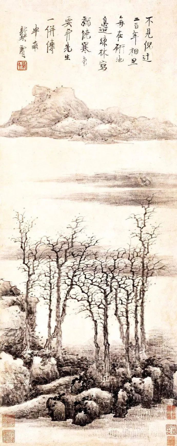 龚贤的山水画意境深邃,富有诗意。他通过对自然景物的描绘,表达出自己对人生、对世界的感悟。他的画面中常常流露出一种宁静、淡泊的气息,让人感受到一种远离尘世喧嚣的宁静与美好。