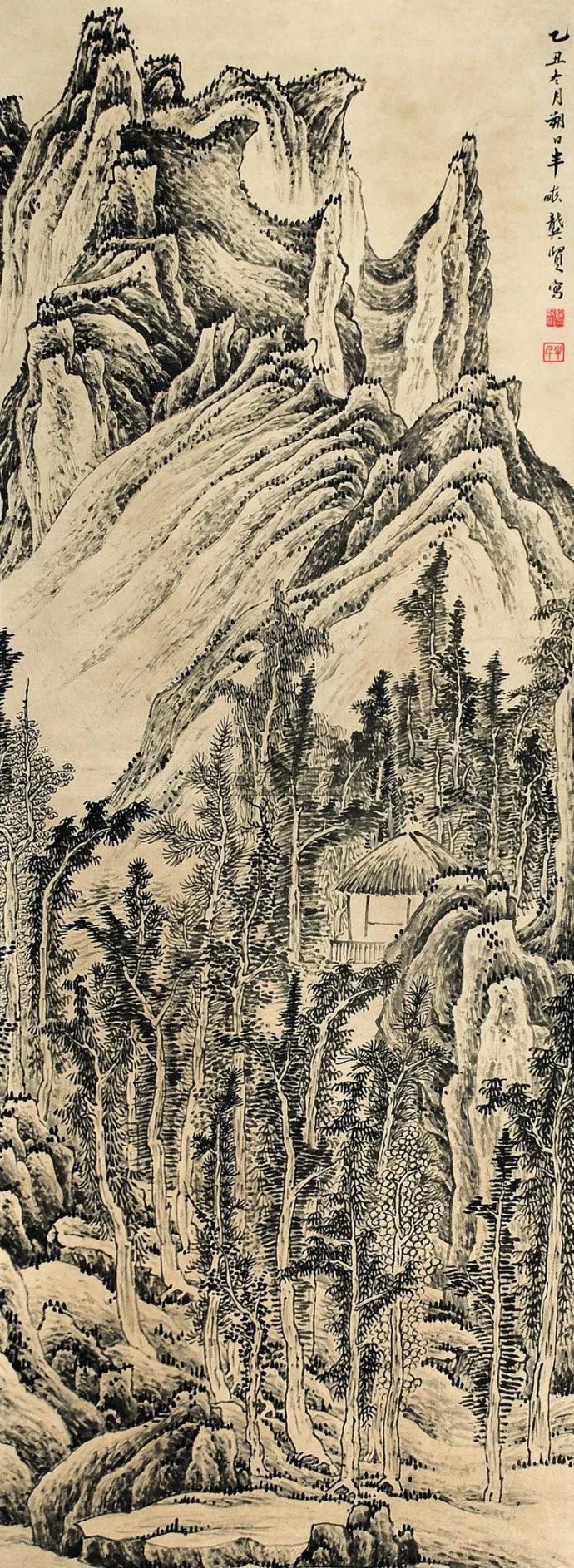 龚贤(1618—1689),明末清初著名画家,金陵八大家之一。他工诗文,善行草,源自米芾,又不拘古法,自成一体。在山水画领域,龚贤以其独特的积墨山水画技法,被誉为“积墨山水,独有千古”。他的山水画作品意境深邃,富有诗意,通过对自然景物的描绘,表达出自己对人生、对世界的感悟。他的画面中常常流露出一种宁静、淡泊的气息,让人感受到一种远离尘世喧嚣的宁静与美好。